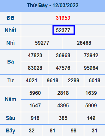– Hình ảnh trên đây cho chúng ta thấy giải nhất ngày 12/03/2022 ra 52377, chúng ta sẽ cộng từ trái qua phải cả các con số như sau: