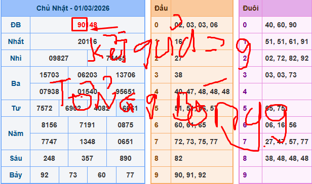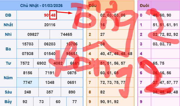 Ví dụ giải đặc biệt của ngày 01/03/2026 có 2 số cuối là 48, chúng ta cộng lại là bằng 12 bóng 1 như vậy chúng ta đã có số đầu để nuôi tuần.