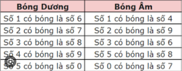 Bóng âm: Số 2 có bóng là 9, số 1 có bóng là 4, số 4 có bóng là 8, số 0 có bóng là 7.